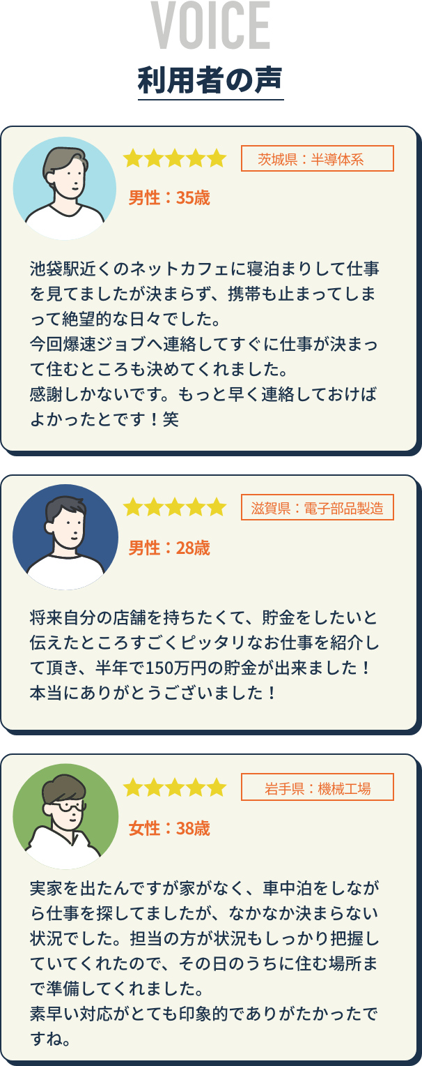 A 他社:当日で寮に入るのは厳しいです。面接をしてから選考、採用まで平均3〜5日ほどかかり、その後入寮するので早くても5〜7日ほどかかります。 爆速ジョブ:爆速ジョブなら応募当日。提携している宿泊施設に入ることができます。所持金がなくても私たちのサポート範囲内で入ることが可能です!