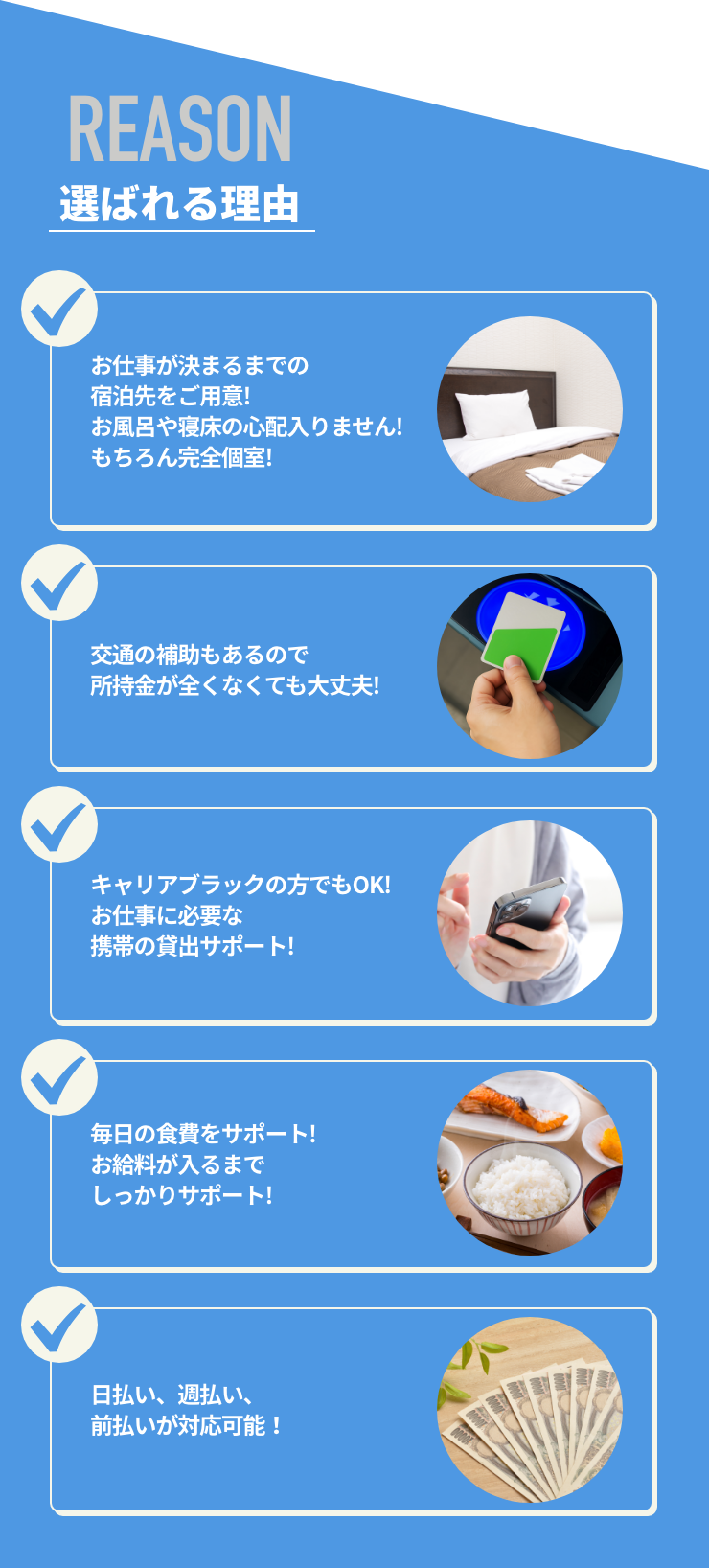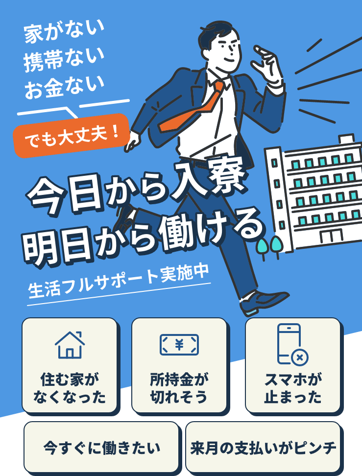 A 他社:当日で寮に入るのは厳しいです。面接をしてから選考、採用まで平均3〜5日ほどかかり、その後入寮するので早くても5〜7日ほどかかります。 爆速ジョブ:爆速ジョブなら応募当日。提携している宿泊施設に入ることができます。所持金がなくても私たちのサポート範囲内で入ることが可能です!
