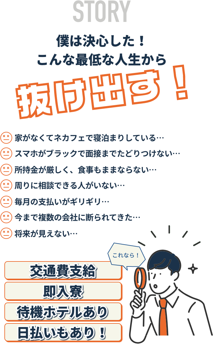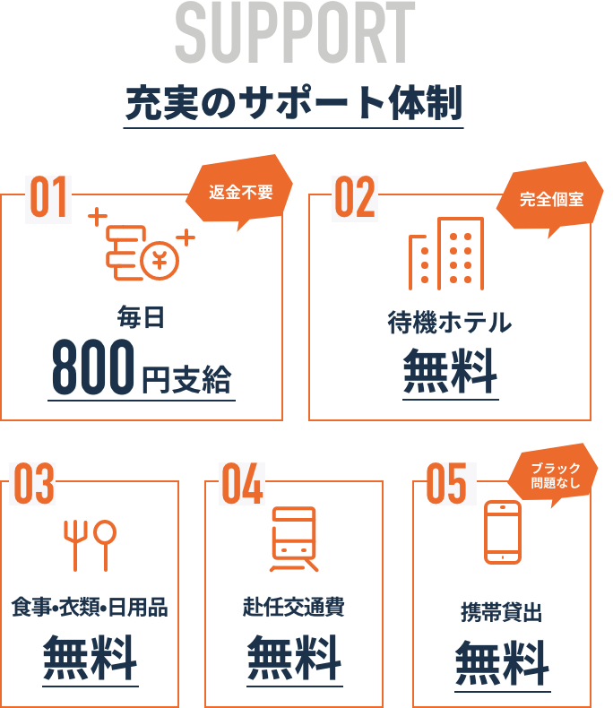 A 他社:当日で寮に入るのは厳しいです。面接をしてから選考、採用まで平均3〜5日ほどかかり、その後入寮するので早くても5〜7日ほどかかります。 爆速ジョブ:爆速ジョブなら応募当日。提携している宿泊施設に入ることができます。所持金がなくても私たちのサポート範囲内で入ることが可能です!